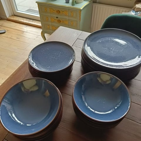 Samlet sæt med stentøjstallerkener i blå/turkis glasur med brun kant.