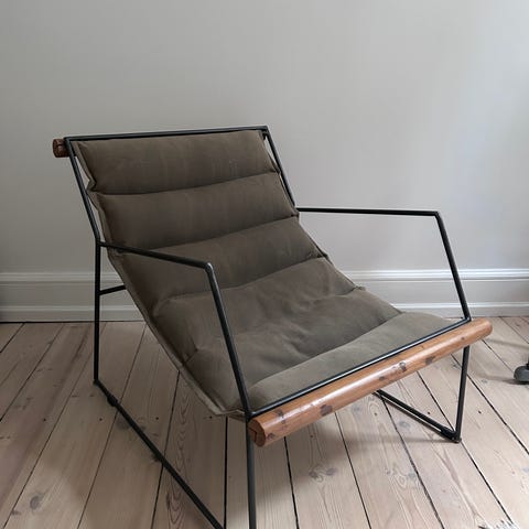 Det er betrukket med det skønneste stof, det samme som min sofa, som er fra Anton Dam. Jeg har købt dem sammen. Det er en stol man sidder rigtigt godt i og den ville også barre god som ammestol
