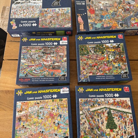 Jan van Haasteren Comic Puzzle puslespil med 2 motiver á 1000 brikker. Sættet indeholder to humoristiske tegneseriemotiver samt en plakat. Velegnet til puslespilsentusiaster, ikke ryger hjem