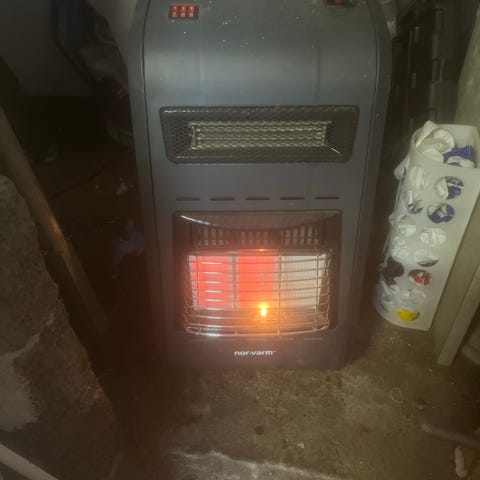 Gasovn fritstående i sort metal. Ovnen er beregnet til brug med gasflaske, som placeres bagtil i kabinettet. Fronten har keramiske varmefelter bag et beskyttelsesgitter. På toppen findes betjeningspanel med tænding og regulering af varme. Ovnen står på hjul, så den kan flyttes efter behov, og er velegnet til opvarmning af mindre rum, værksted eller sommerhus, hvor der er adgang til gasflaske eller strøm. Ovnen kan også blæse kun luft.