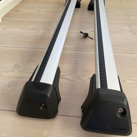 Tagbøjler fra Volvo, fra 2022. Sættet består af to tværgående tagbøjler i aluminium, med sort plastfod og integreret lås. Bøjlerne er vingeformede for lav vindmodstand og støj, og velegnede til montering på bilens tag for transport af f.eks. tagboks, cykelholder eller andet taglastsystem. Passer til Volvo XC60 2.0