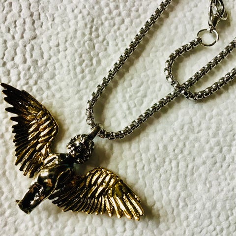 Spinkel, forgyldt halskæde med et MEGET FLOT VEDHÆNG af gotiske englevinger i sølv og sort og med mørkegrønne sten. Kæden er 45 cm + 5 cm forlængerkæde og vedhænget er 5x5 cm. Vedhænget er meget smukt udført. Smykket er helt nyt.