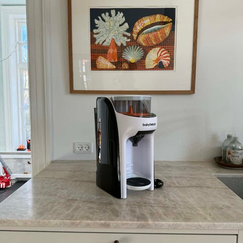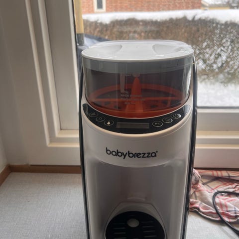 Baby Brezza Formula Pro Advanced mælkepulvermaskine i hvid. Maskinen er beregnet til automatisk blanding og dosering af modermælkserstatning med vand. Den kan bruges til tilberedning af sutteflasker med jævn temperatur og konsistens. Velegnet til brug i hjemmet til spædbørn og småbørn, hvor der ønskes en ensartet tilberedning af modermælkserstatning.