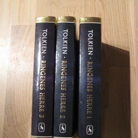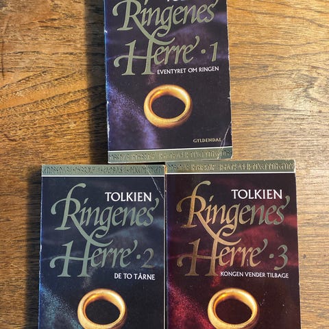 Tolkien Ringenes Herre bogsæt på dansk bestående af tre bind: "Eventyret om ringen" (bind 1), "De to tårne" (bind 2) og "Kongen vender tilbage" (bind 3). Paperback-udgaver med illustrerede forsider og blå rygge. Bøgerne er den danske oversættelse af fantasytrilogien om ringen og følges kronologisk som samlet serie.
