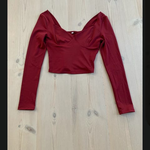 Langærmet, sort t-shirt i rib med blondekant i halsudskæringen.