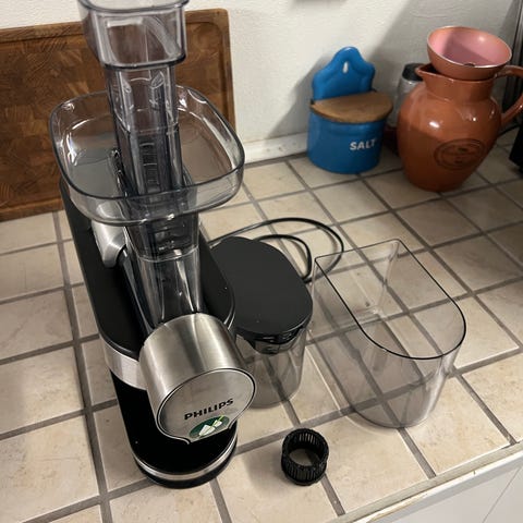 Philips juicer i hvid. Juiceren er egnet til tilberedning af juice af frugt og grøntsager i hjemmet. Enheden har en påfyldningstragt for hele eller større stykker frugt og grønt og en separat beholder til juice. Velegnet til almindelig køkkenbrug.