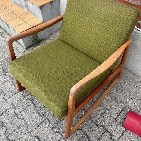 Smuk og tidløs lænestol model FD110 med elegant stel i massivt teaktræ og løse hynder i beige stof. Stolen har det karakteristiske lette og organiske formsprog fra dansk designtradition, med flotte afrundede armlæn og solid håndværksmæssig kvalitet.