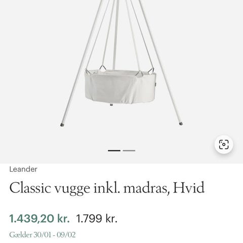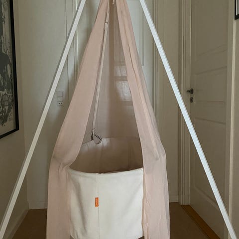 Leander vugge i hvidt stof. Oval stofkurv med fast bund og ophængsstropper til montering i loft eller stativ. Vuggen har fire metalringe til ophæng og aftagelig madrasbund. Velegnet til spædbørn som soveplads i hjemmet. Neutral, lys farve der passer ind i de fleste børneværelser.