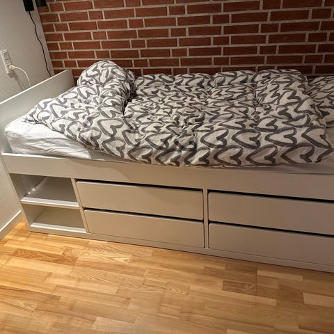 IKEA seng med indbyggede skuffer under liggefladen. Sengen er udstyret med to rummelige skuffer, der kan bruges til opbevaring af fx sengetøj, puder eller tøj. Overfladen er egnet til en enkeltmadras. Velegnet til brug i soveværelse, gæsteværelse eller børneværelse, hvor der er behov for ekstra opbevaringsplads under sengen.