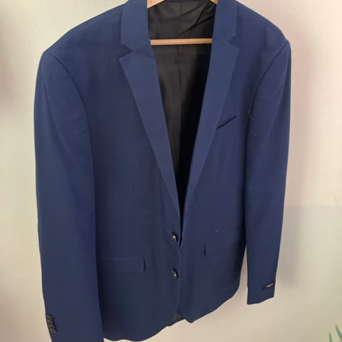 Jack & Jones jakkesæt til herre i str. 44. Sættet består af blazer, vest og bukser i blå polyester. Klassisk to-knaps blazer med lommer foran og foret inderside. Matchende vest med knaplukning og to forlommer. Bukser i samme blå polyesterkvalitet som jakke og vest. Velegnet som formelt sæt til f.eks. arbejde, konfirmation eller andre lejligheder, hvor der ønskes et ensartet jakkesæt i blå polyester.