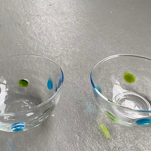 Glas askebæger reklame med trykt motiv af bygningen "Det gamle Vinhuus i Randers" i midten. Skålen har et grafisk linjemønster ud fra midten.