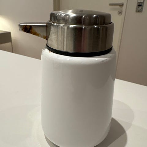 Vipp sæbedispenser i hvid med pumpe og låg i rustfrit stål. Beholderen har aftageligt låg med pumpeindsats i plast og stål, som kan fyldes med flydende sæbe. Velegnet til brug på badeværelse eller i køkken. Designet til bordplacering.