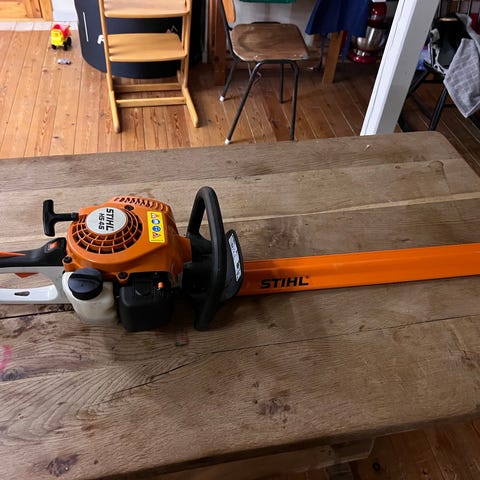 Stihl HS 80 hækkeklipper med benzinmotor. Modellen har et orange og lyst kabinet med integreret håndtag og startmekanisme. Egnet til klipning og trimning af hække og buske i have og udendørsarealer. Drevet af en 2-takts benzinmotor, som typisk giver god bevægelsesfrihed uden behov for strømtilslutning. Maskinen har sikkerhedsafbryder og betjeningsknapper placeret ved håndtaget for nem betjening under arbejde.
