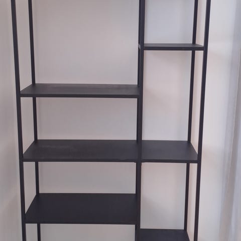 . Reolen er udført i sortlakeret metal med perforerede metalhylder. Modellen har to åbne hylder med kant, som giver mulighed for opbevaring af for eksempel bøger, magasiner eller mindre genstande. Enkel, fritstående konstruktion i let metalramme, velegnet til brug i stue, entré eller kontor.