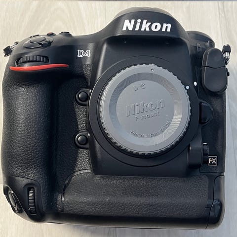 Nikon D4 digitalt spejlreflekskamera i sort. Kamerahuset er et professionelt full-frame DSLR med integreret vertikalgreb. På billederne ses kamerahuset uden objektiv, samt tilbehør i form af batterier og en Nikon WT-5 trådløs sender. Velegnet til brugere, der har behov for et robust kamerahus med mange fysiske knapper og avancerede indstillingsmuligheder. Objektiv medfølger ikke, og der anvendes Nikon F-fatning til montering af objektiver.