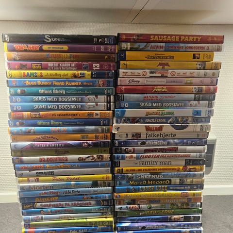 Blandet samling dvd film til børn og familie. Stakken indeholder forskellige titler inden for tegnefilm, animationsfilm og familiefilm. Flere kendte serier og film kan indgå i samlingen. Egnet til afspilning på standard dvd‑afspillere. Antal og præcise titler fremgår af billedet.