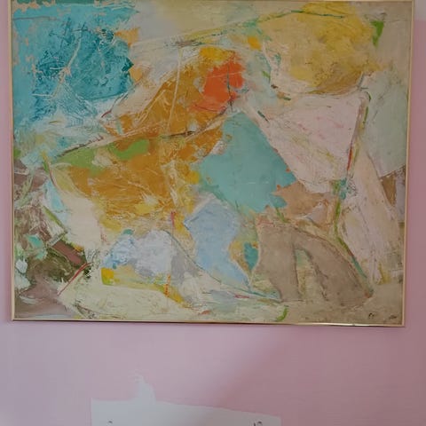 Farverigt, figurativt og abstrakt værk med bl.a. kranie, dyr og teksten "As Seen On TV”.