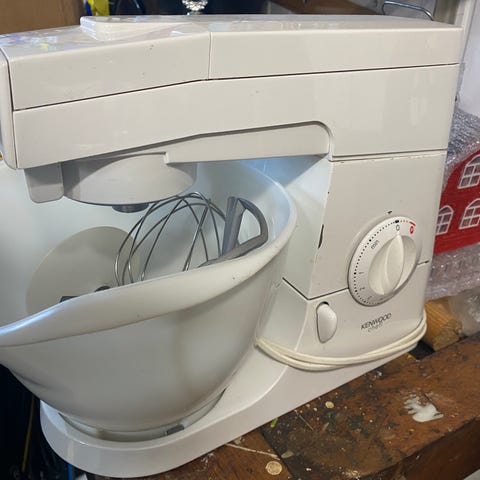 Kenwood KM330 køkkenmaskine i hvid farve. Maskinen har en skål i rustfrit stål og flere tilbehørsdele til forskellige køkkenopgaver. Strømkabel medfølger. Velegnet til blanding, æltning og piskning i hjemmet.