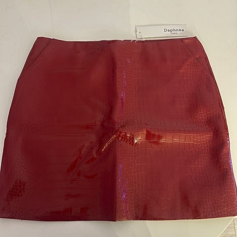 Rød nederdel i str. L til kvinder. Nederdelen har elastik i taljen og en markant udskæring i sidenr med krydsede snører. Kort og sexy model. Blød elastisk materiale behagelig at have på.