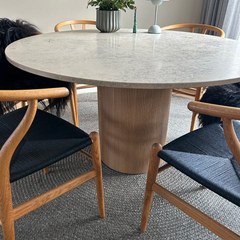 Materialer: Robust stålbase og en unik bordplade i stentøj.