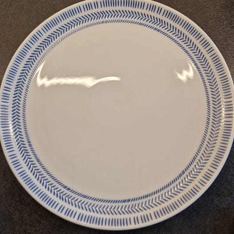 Porcelænsskål fra det eksklusive, britiske mærke, Royal Doulton. Skålen er designet af den amerikanske talkshowvært Ellen DeGeneres. Hvid m. grå striber.