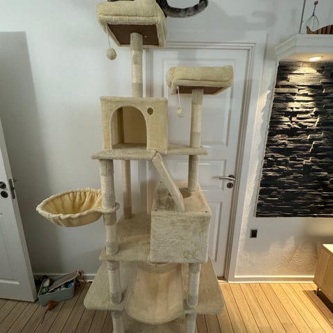 Giv din kat et komplet kattelegeunivers i hjemmet. Dette slanke kattetræ på 199 cm kombinerer flere niveauer, store platforme og en rummelig hængekøje, så din kat kan klatre, slappe af og tage lure i højden. Designet gør det let at komme op og ned - ideelt til både nysgerrige killinger, seniorer og katte, der ikke bryder sig om store spring.