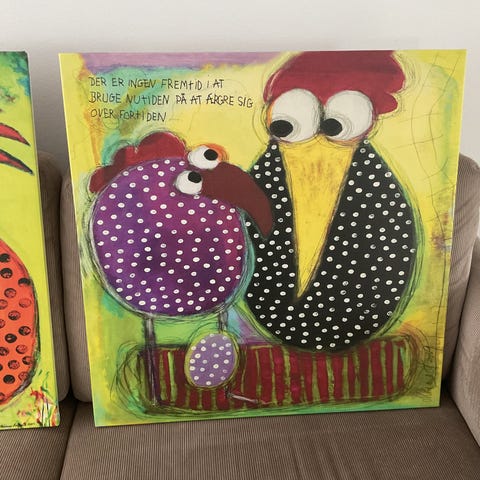Sjove fuglebilleder med citater, lærredstryk af Marianne Hougaard på træramme, 61x61 cm, ikkeryger hjem