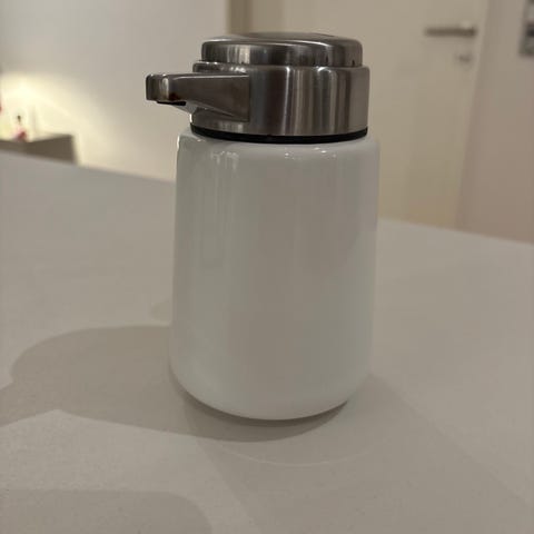 Vipp sæbedispenser i hvid med låg og tud i rustfrit stål. Dispenseren har brugssport og har lidt rust på både låg og på beholderen. Jeg har ikke forsøgt at fjerne rusten. Fungere fint.