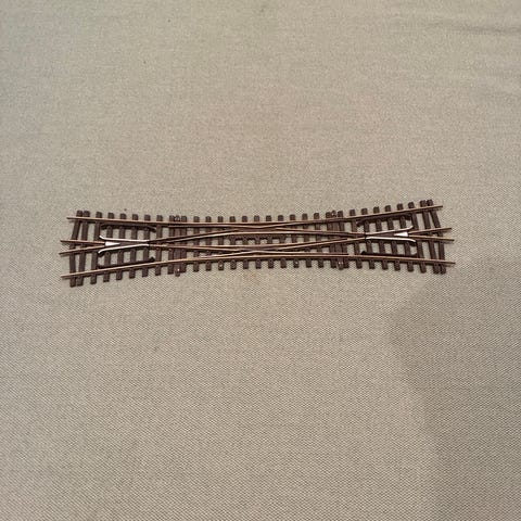 Modeljernbane krydsspor i metal til brug på modeltogbane. Sporene er udført i metal med sveller og skinner, velegnet til opbygning af krydsende sporforløb. Egnet til hobbybrug og udvidelse af eksisterende modeljernbaneanlæg.