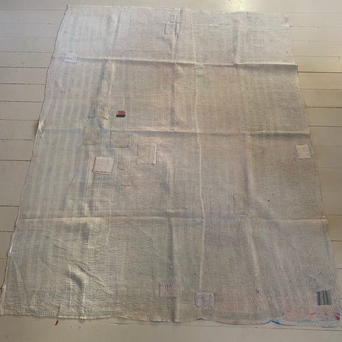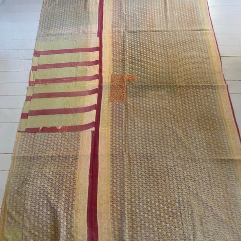 Meget smukt sengetæppe med lyserød bund og blomster. Indisk sari og østens mystik. Der er lidt brugsspor. Måler 210 x 240.