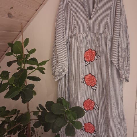 Kjolen har en draperet rund halsudskæring med en lille slids foran, der tilføjer et sofistikeret og afslappet touch. Den er yderligere dekoreret med poetisk blomsterbroderi i kontrastfarve, som skaber et iøjnefaldende og romantisk udtryk. For at fuldende det smukke design er kjolen prydet med specialvalgt ladder tape, der giver en subtil, men markant dekoration langs sømmene.