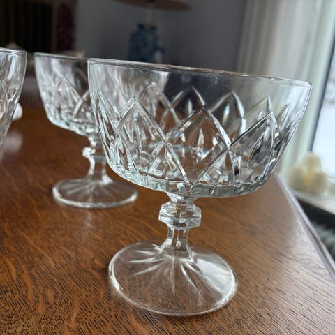 Franske VMC glas. Har 9 stk Disse champagneskåle/Cocktail glas, lavet af krystal og har et elegant mønster. De er velegnede til servering af champagne eller andre festlige drikke