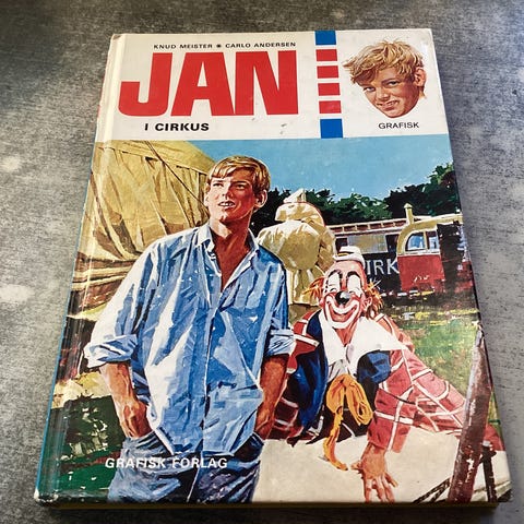 Jan i cirkus , Knus Meister og Carlo Andersen, genre: roman, Hardback 30 plus. Fragt