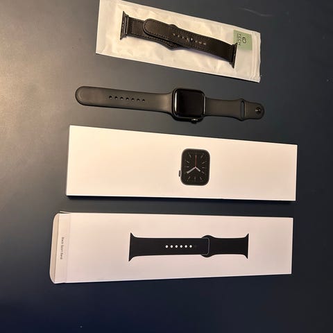 Apple Watch smartwatch med rektangulær skærm og gråt nylonrem. Uret har sensorfelt på bagsiden til måling af aktivitet og puls. Remmen er justerbar og egnet til daglig brug. Velegnet som smartwatch til brug sammen med kompatible Apple-enheder. Serie 6