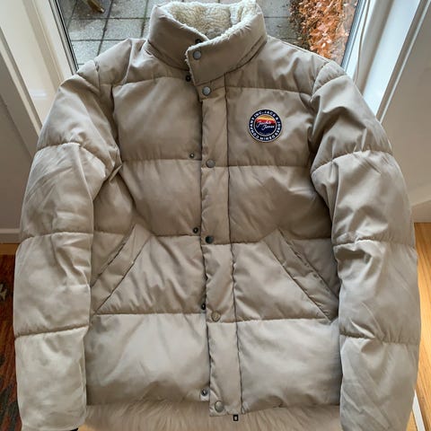 Dunjakke med et par enkelte misfarvninger i kraven, som det fremgår på de sidste to billeder.