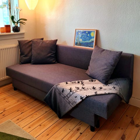 I am selling our beloved sofa bed. It’s a very practical sofa bed because it has storage space and can be folded out to a bed which is perfect for guests.