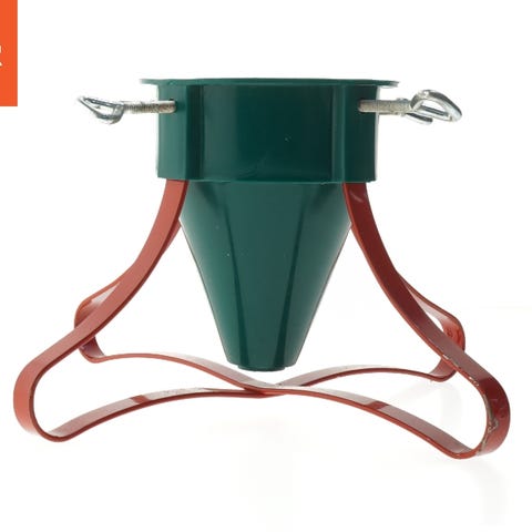 Juletræsfod i grøn plast. Foden har et centralt hul med fastgørelsesmekanisme til juletræet og en spændeskrue i siden til at holde stammen på plads. Velegnet til indendørs brug til opsætning af juletræ.