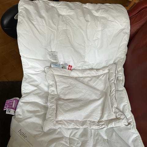 Babydyne og matchende hovedpude i hvid. Sættet består af en mindre dyne og en lille pude, velegnet til brug i babyseng, barnevogn eller lift. Quiltet syning holder fyldet jævnt fordelt.