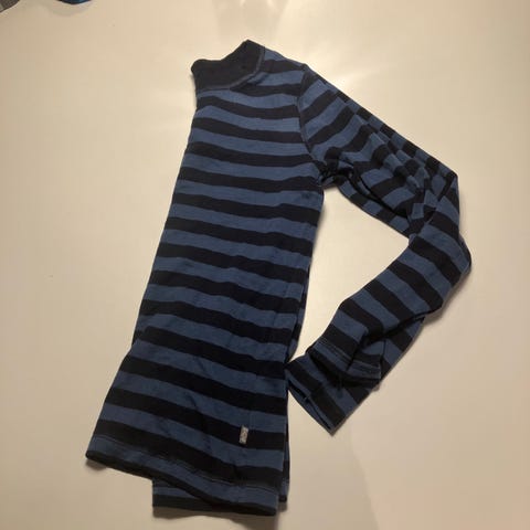 Katvig uldtrøje til børn i str. 110. Blå striktrøje i uld, unisex-model med striber og ribkanter ved ærmer og talje. Velegnet som varm hverdagstrøje eller som ekstra lag på kølige dage.