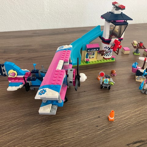 LEGO Friends sæt med fly og kontroltårn. Sættet indeholder et farverigt propelfly, et lille kontroltårn med rutsjebane samt flere små tilbehørsdele og minifigurer/dyr, som kan bruges til legescenarier i en lufthavn. De enkelte klodser er sorteret i poser, og der medfølger en trykt byggevejledning, som viser, hvordan modellen samles og kan bygges op igen.