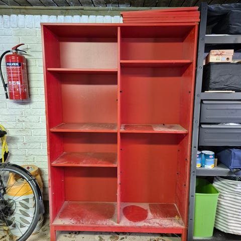 Reol med hylder, skabe og skuffer i fyrretræ gives væk.