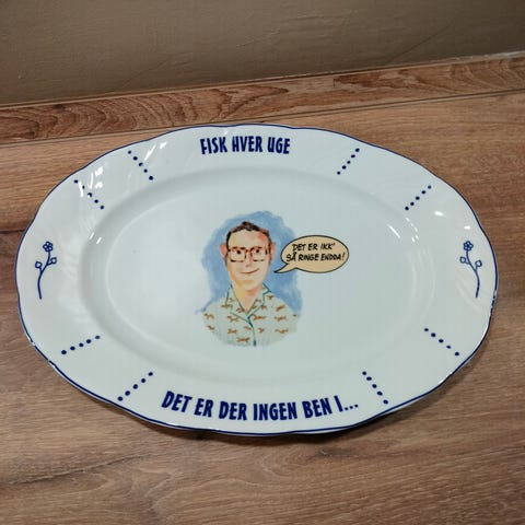 Dette er et retro fiskefad med et motiv af Niels Olsen fra Gunnar og Minna-reklamerne.