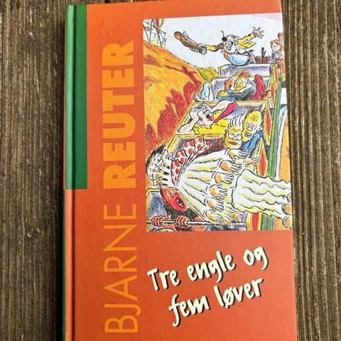 Bjarne Reuter Tre engle og fem løver bog. Skønlitterær roman i hardback-udgave på dansk. Velegnet til læsere af moderne dansk litteratur og ungdoms-/voksenromaner.