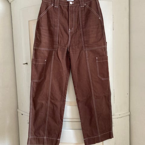 Bukserne er i en bordeaux/vinrød farve og fremstillet af 98 % bomuld og 2 % elastan, hvilket giver lidt stræk.