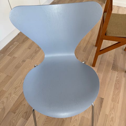 Fritz Hansen Serie 7 stol designet af Arne Jacobsen. Skalstol med formspændt sæde og ryg i gul lak/finér og ben i metal. Egnet som spisebordsstol eller ekstra siddeplads i stue, køkken eller kontor.