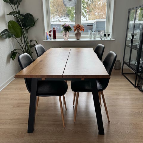Bordet har et par små skrammer og nogle af stolene har filten under dem et par sprækker.