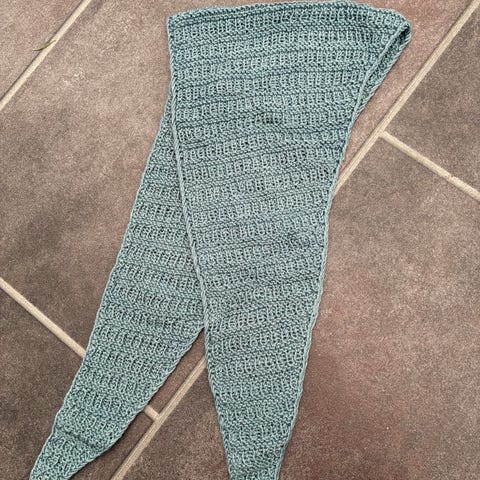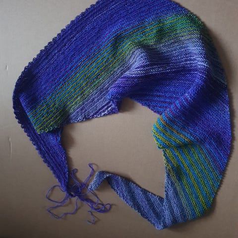 Færdigstrikket Marsk-tørklæde incl. original opskrift. Strikket af 100 gr Uneek Fingering Weight 100% SW Extrafine Merino. Kradser slet ikke. Er dejlig blødt. Lilla, grøn og lidt blå. Asymmetrisk. Færdig længdemål: ca. 180 cm. Kan måske leveres i det oprindelige HT-område. Se billede af tørklædet på den anden annonce fra min helårsadresse (er cpr-valideret der).