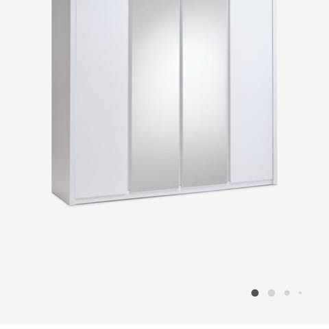 Garderobeskab i hvid. Skabet har flere sektioner med bøjlestænger og integrerede skuffer, som giver mulighed for ophængning af tøj og opbevaring af mindre genstande som fx tøj, accessories og sengetøj.