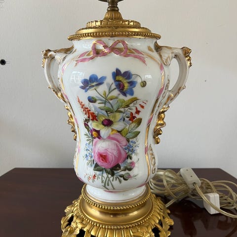 Fin gammel bordlampe i mørk blå med guld og bronce pynt
