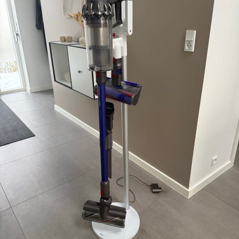 Dyson V8 trådløs støvsuger med aftageligt rør og flere mundstykker. Støvsugeren leveres med motoriseret gulvhoved, vægophæng med oplader, fugemundstykke og kombinationsmundstykke med børste. Enheden kan bruges både som almindelig stavstøvsuger og som håndholdt støvsuger til rengøring af gulve, møbler, trapper og svært tilgængelige steder.